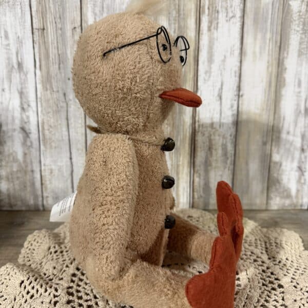 Meet Professor Puddles, the quietly scholarly duck who looks like he’s about to grade your pond-crossing homework. He’s cut from soft, time-worn tan chenille with a fuzzy white tuft that sticks straight up like he just had a big idea, and round wire-frame glasses that perch over bead-bright eyes. An orange felt bill and big webbed feet give him that friendly duck silhouette, while three antiqued jingle-bell “buttons” run down his chest from a simple twine collar—just enough rustic charm without trying too hard.