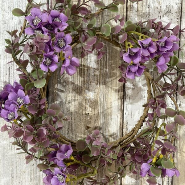 Bring a little meadow indoors with this sweet, rustic candle accent. Designed to encircle standard pillar candles, the ring has a 4.5‑inch inner opening and is crafted from a twiggy grapevine base wrapped with clusters of fabric‑petal purple wildflowers—each bloom tipped with a soft, frosted stamen—and sprigs of rounded eucalyptus‑style leaves in muted sage and dusty plum. The color palette stays gentle: lavender‑purple blossoms against green‑purple foliage, with yellow‑green stems peeking through for a natural touch.