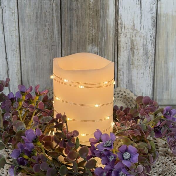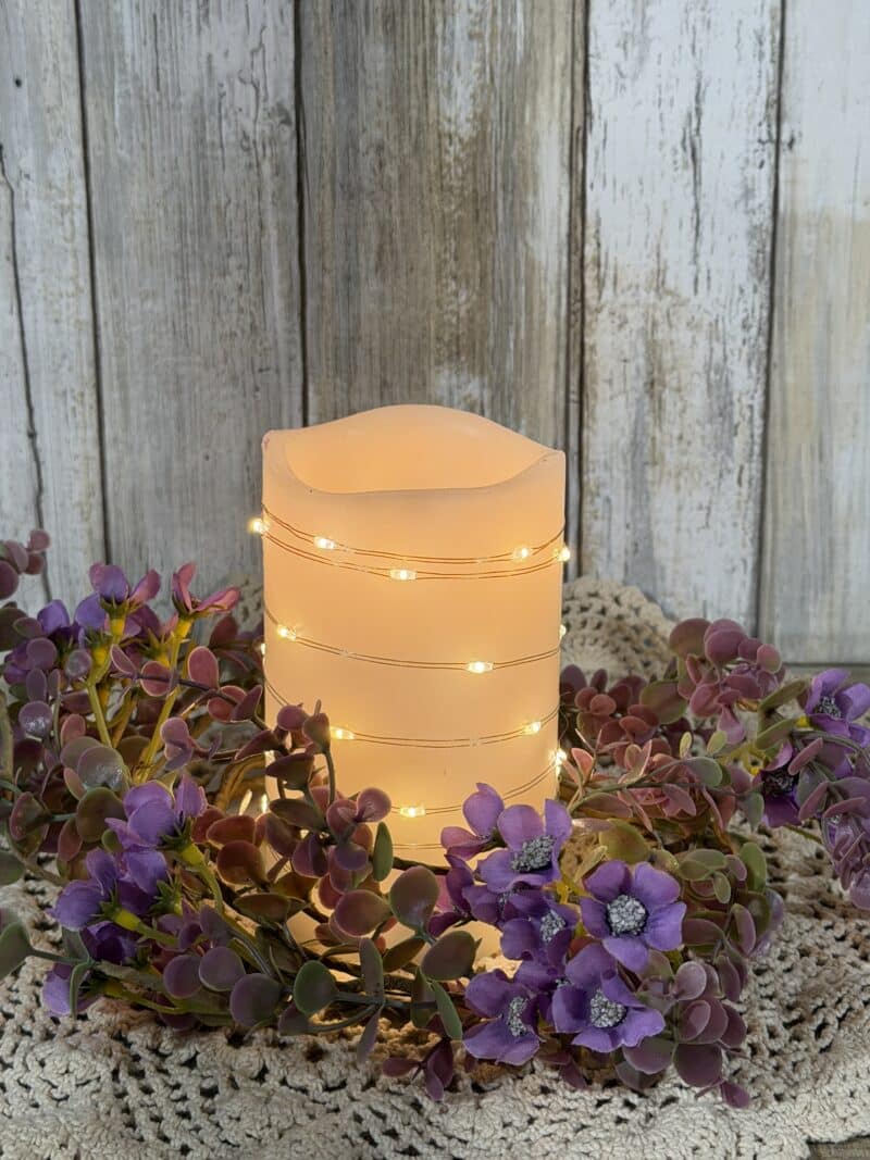 Bring a little meadow indoors with this sweet, rustic candle accent. Designed to encircle standard pillar candles, the ring has a 4.5‑inch inner opening and is crafted from a twiggy grapevine base wrapped with clusters of fabric‑petal purple wildflowers—each bloom tipped with a soft, frosted stamen—and sprigs of rounded eucalyptus‑style leaves in muted sage and dusty plum. The color palette stays gentle: lavender‑purple blossoms against green‑purple foliage, with yellow‑green stems peeking through for a natural touch.