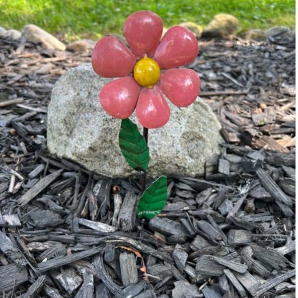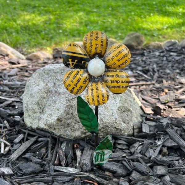 Pieces of recycled metal are bent and molded to make the petals and leaves of a daisy, the stem of the daisy is also metal. Some of the metal used has lettering or designs from previous use. Due to the handmade nature and ceyscled metal every daisy will be different. Uniquely created with interesting details, this unusual art form adds character and visual value to your home displays.