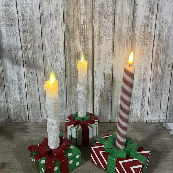 Add a touch of merry charm to your holiday decor with this set of three resin gift taper candle holders!