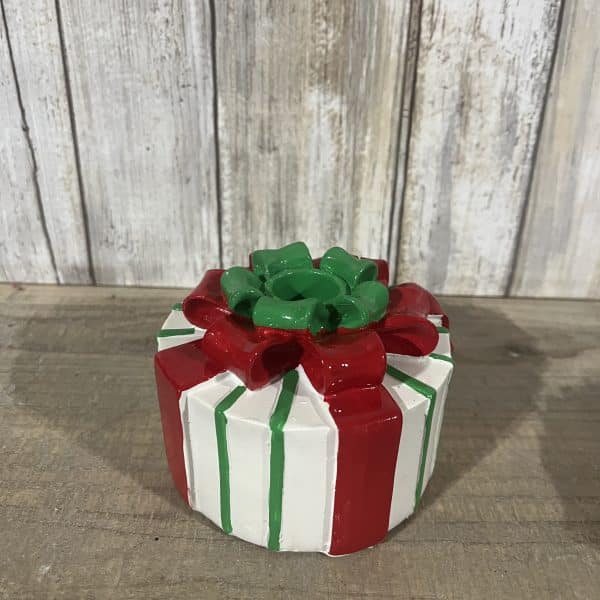 - Round Gift: 4″ D x 3.25″ H with a striking red and white stripe pattern and a green and red bow.