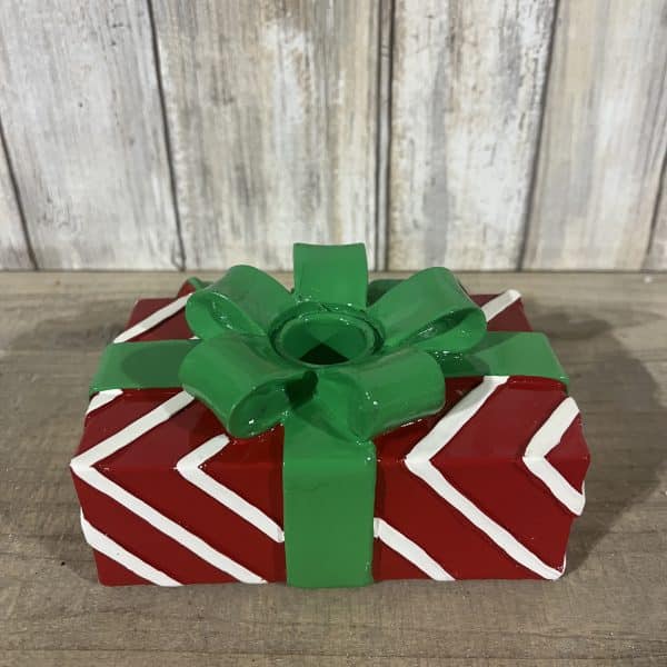 - Long Rectangular Gift: 5″ L x 3″ W x 2.75″ H featuring red and white stripes with a green bow.