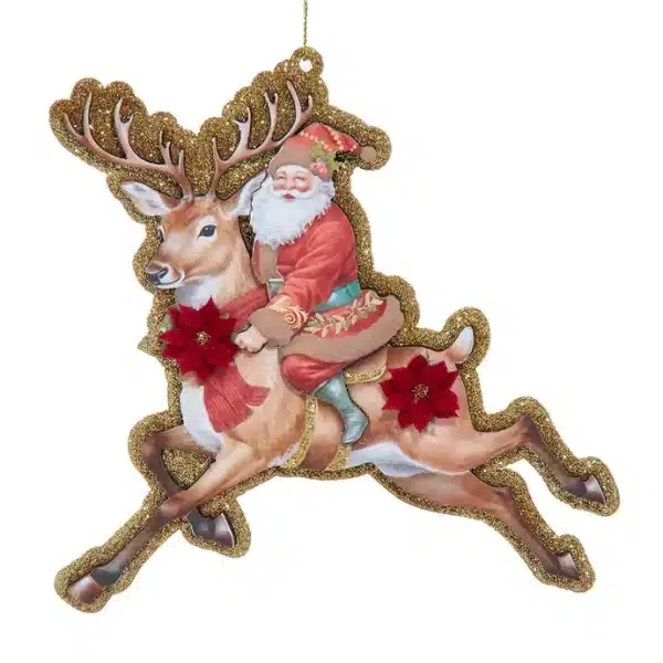 Bring a touch of whimsy to your holiday decor with Kurt Adler’s enchanting Santa On Deer Ornament! This charming ornament features Santa Claus riding gracefully on a beautifully crafted deer, showcasing a delightful blend of festive spirit and playful design. Made from high-quality MDF, this ornament is lightweight yet durable, making it perfect for hanging on your Christmas tree or adorning wreaths and garlands. The intricate detailing captures the magic of the season, with vibrant colors that bring this joyful scene to life.
