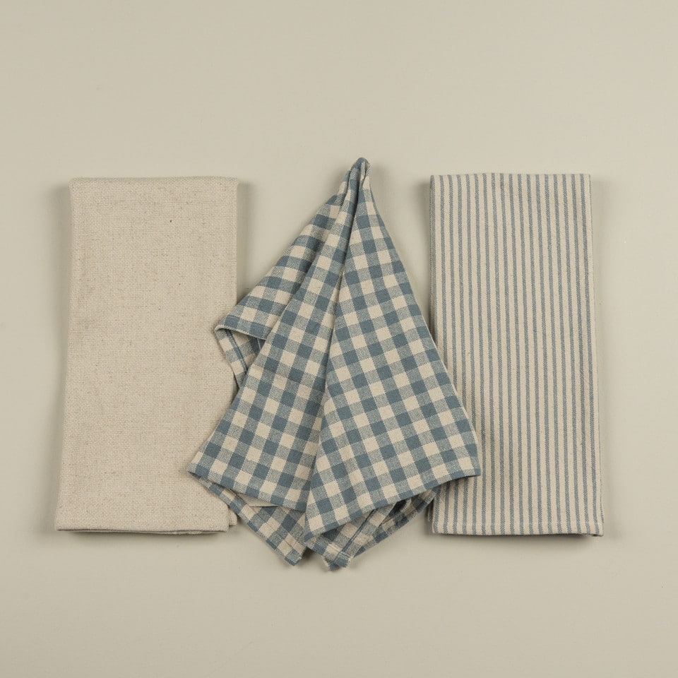 Elevate the heart of your home with this charming set of three kitchen towels, designed to blend timeless farmhouse aesthetics with everyday functionality. Featuring a soothing palette of dusty blue and cream, this coordinated set offers a mix of classic patterns that add a touch of effortless style to any kitchen decor.
