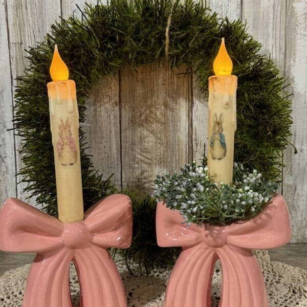 Bring a little everyday pretty to your mantel, shelves, or tablescape with this pair of bow-shaped ceramic holders. Each piece is molded as a full, glossy bow in a soft blush-pink glaze, with a center opening sized for standard tapers .