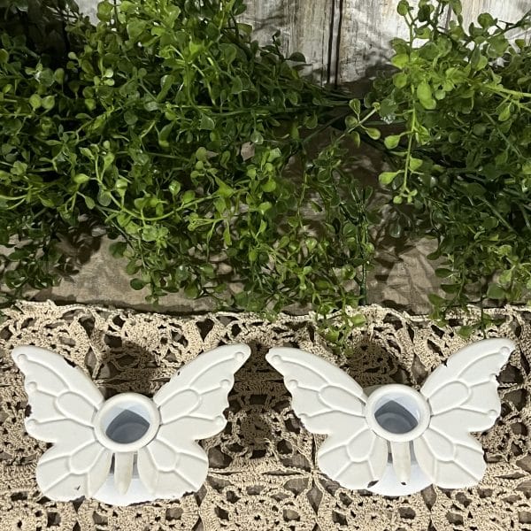 Set of 2 White Distressed Metal Butterfly Taper Holders