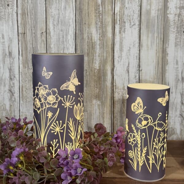 Bring a little wildflower calm indoors with this pair of frosted violet glass luminaries. Each cylinder is etched with delicate meadow scenes—swaying stems, blossoms, and butterflies—that glow warmly when lit, turning simple silhouettes into a soft, summery vignette.