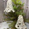 Each ornament is made from metal which has a raised design. They are a creamy white with chippy and rusty spots.  There may be some color variation between all three ornaments.  Each ornament has a hanger made from rusty wire. Each set has 1 Tree (9.6”long x 6.8” wide), 1 Stocking ( 8” long x 5” wide), and 1 Sleigh (8” wide x 6” high).