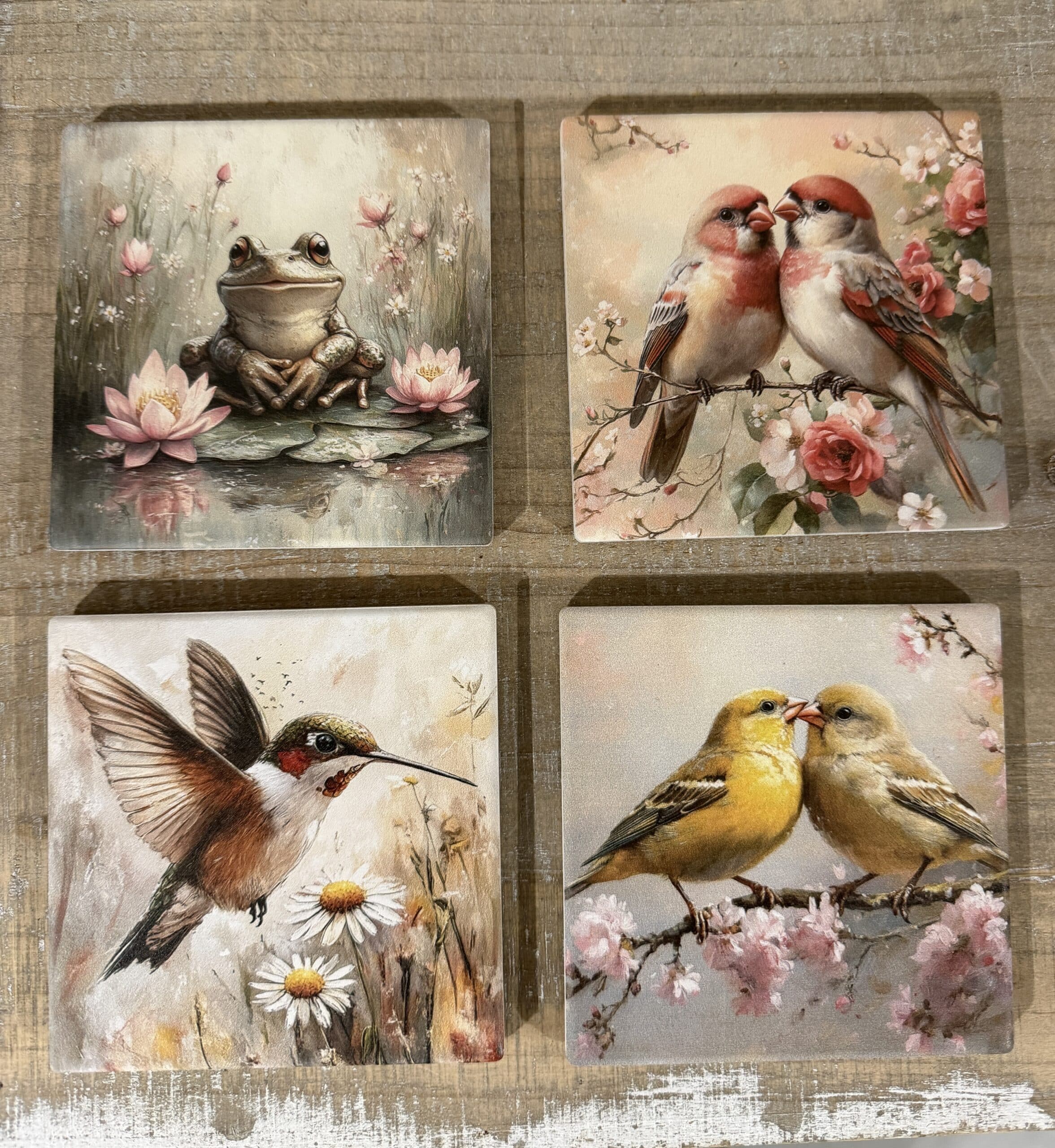 Bring the peaceful beauty of the outdoors into your home with our Garden Friends Slate Coaster Set. This collection features four stunning, artistically rendered scenes that capture the quiet charm of nature—from a serene frog among water lilies to the delicate flutter of a hummingbird and songbirds in bloom.