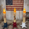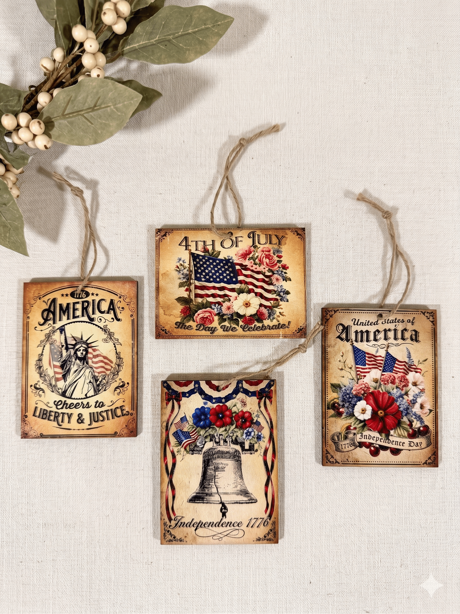 Celebrate the heritage of the red, white, and blue with this elegant set of four handmade Independence Day ornaments. This collection blends traditional patriotic imagery with lush botanical accents, offering a softer, “Victorian Americana” take on the classic primitive style.