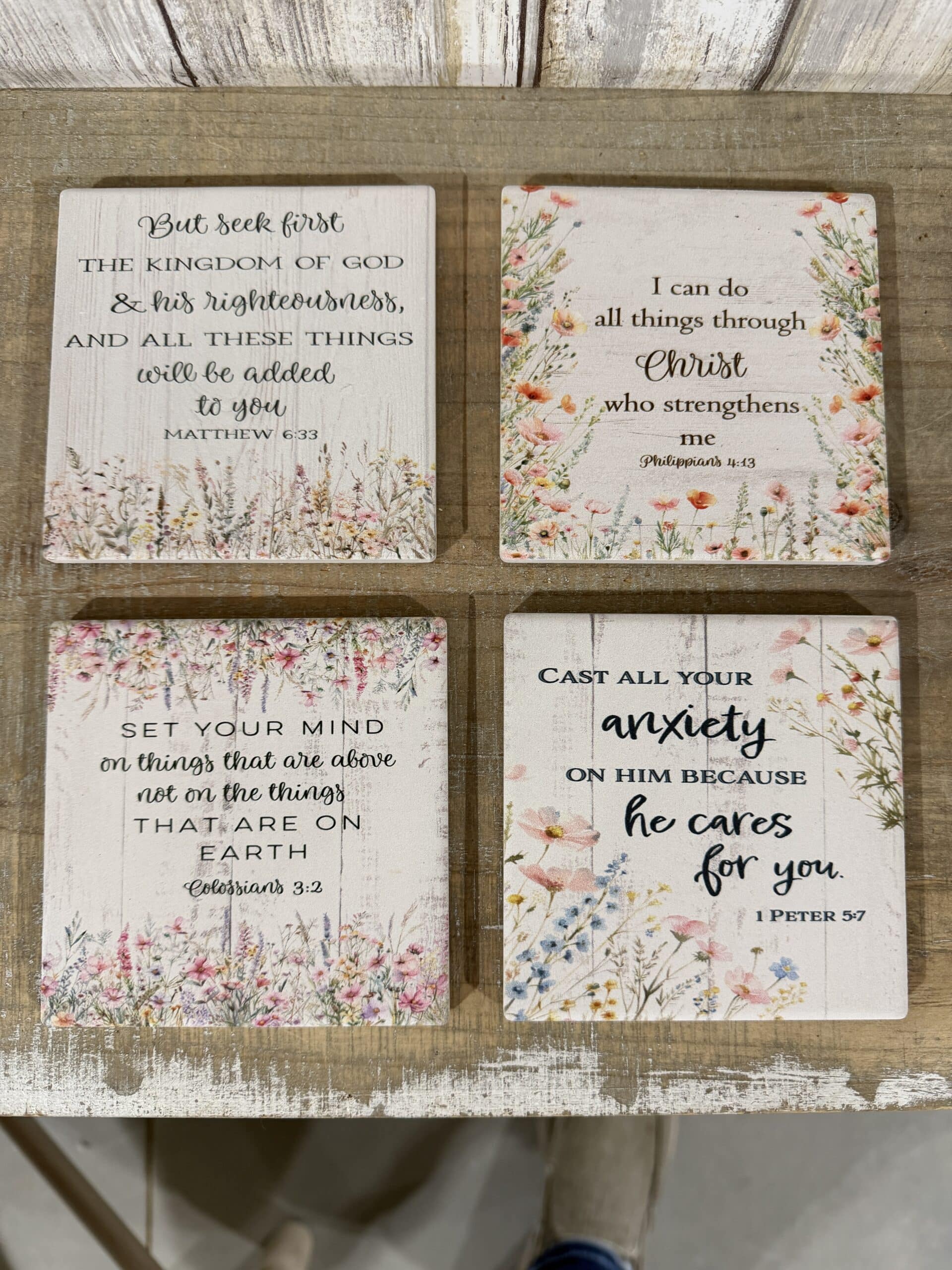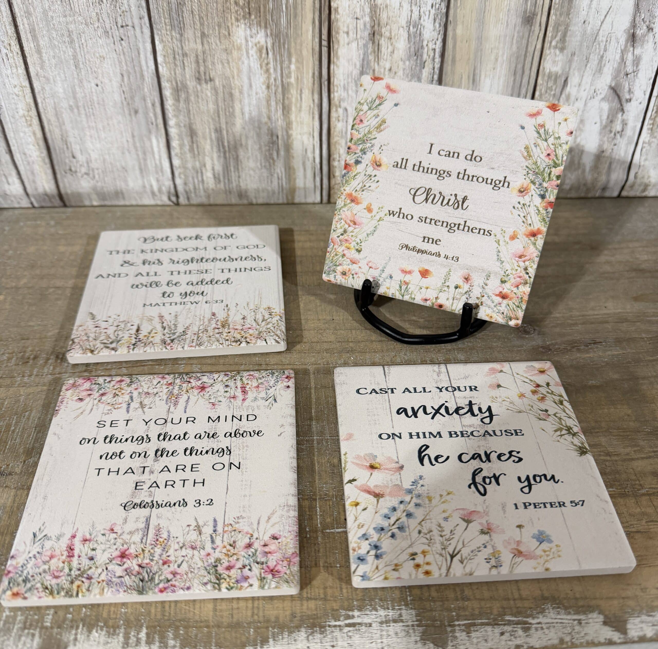 Each coaster features a different hand-selected verse designed to offer daily encouragement, strength, and a reminder of what truly matters. The soft pinks, yellows, and purples of the floral borders contrast beautifully against the white-washed wood grain effect printed on the slate, making these a perfect fit for farmhouse, cottagecore, or traditional decor.