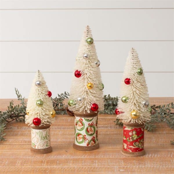 This set of three vintage spool Christmas trees is an ideal way to transport your Christmas decor to a more nostalgic time. Add the set to your table top or shelf for a visit back to vintage Christmas.
