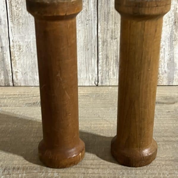 This is a set of two vintage wooden spools that would be great to display in a dough bowls with other vintage items or used in your crafts. Wrap some ribbon or fabric around them and add a bottle brush tree in the top! Spools may vary in color due to the antique nature.
