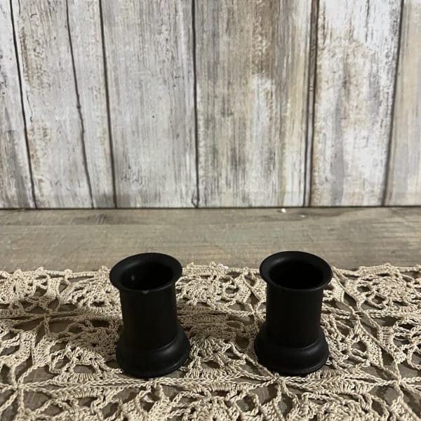 The Shelf Candle Cup is a spool-shaped single taper holder with a matte black metal finish. 1-3/4″ H x 1-1/2″ diameter.