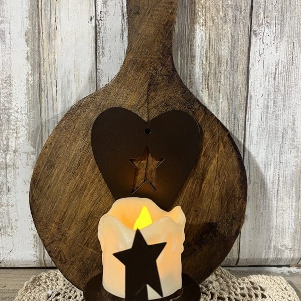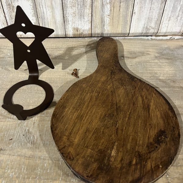 In this Small Breadboard Breadboard Pillar Sconce Kit you will receive one small wooden breadboard which is handmade in Lancaster, PA, one metal wall pillar sconce, and two rusty screws to attach the pillar holder to the breadboard.