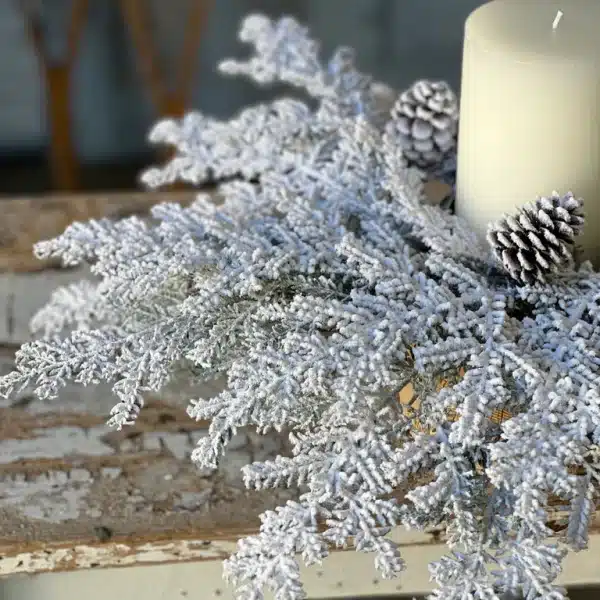 The Snowy Hemingway Fir provides a winter wonderland feel with is heavily flocked filigree like branches and peppering of natural pine cones. A sheen of glitter adds an extra element of elegance to this already gorgeous candle ring.