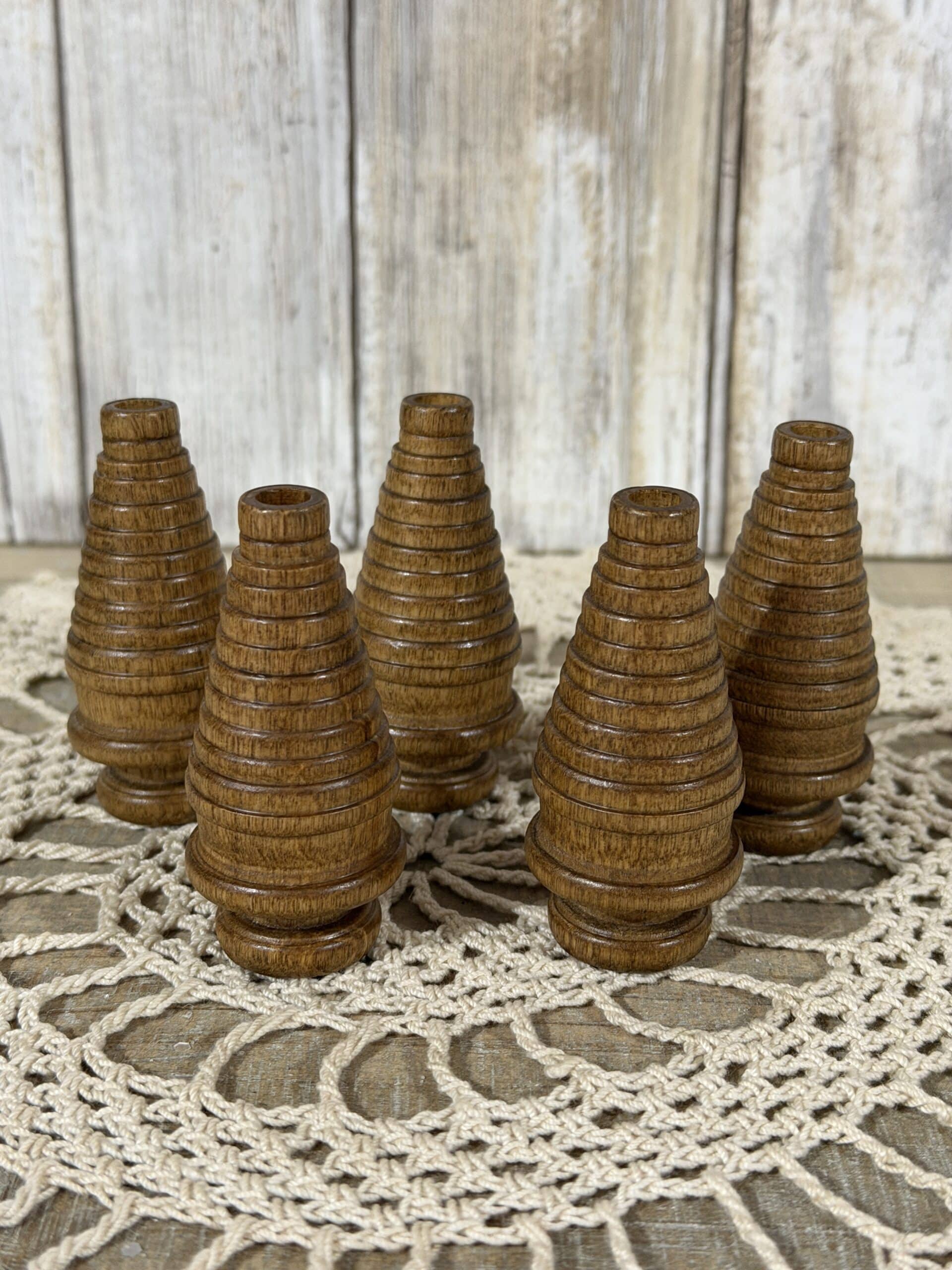 Vintage Wooden Tree‑Shaped Bobbin Set (5 pieces) – 2.75″ × 1.25″. Wooden bobbins with a rustic tree form, ideal for bowl fillers or crafting projects. Perfect for decorative accents or DIY use.