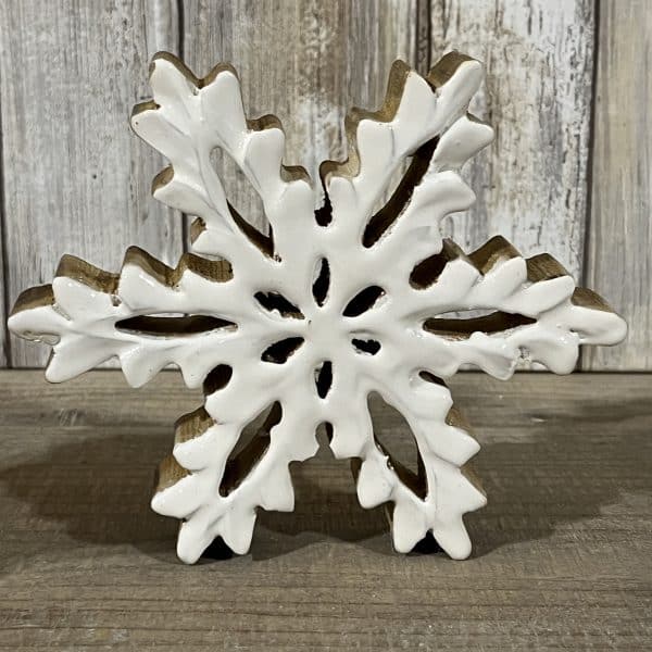 Add a touch of winter whimsy to your space with this charming wood enameled snowman and snowflake set. Crafted from wood with a glossy white enamel finish, the adorable snowman figurine features a top hat and stick arms. Perfect for holiday decor or year-round winter charm, it sits beautifully on a shelf or table. The snowman pairs nicely with the beautifully delicate wood enamel snowflake. This set is perfect for rustic or cozy winter themes.