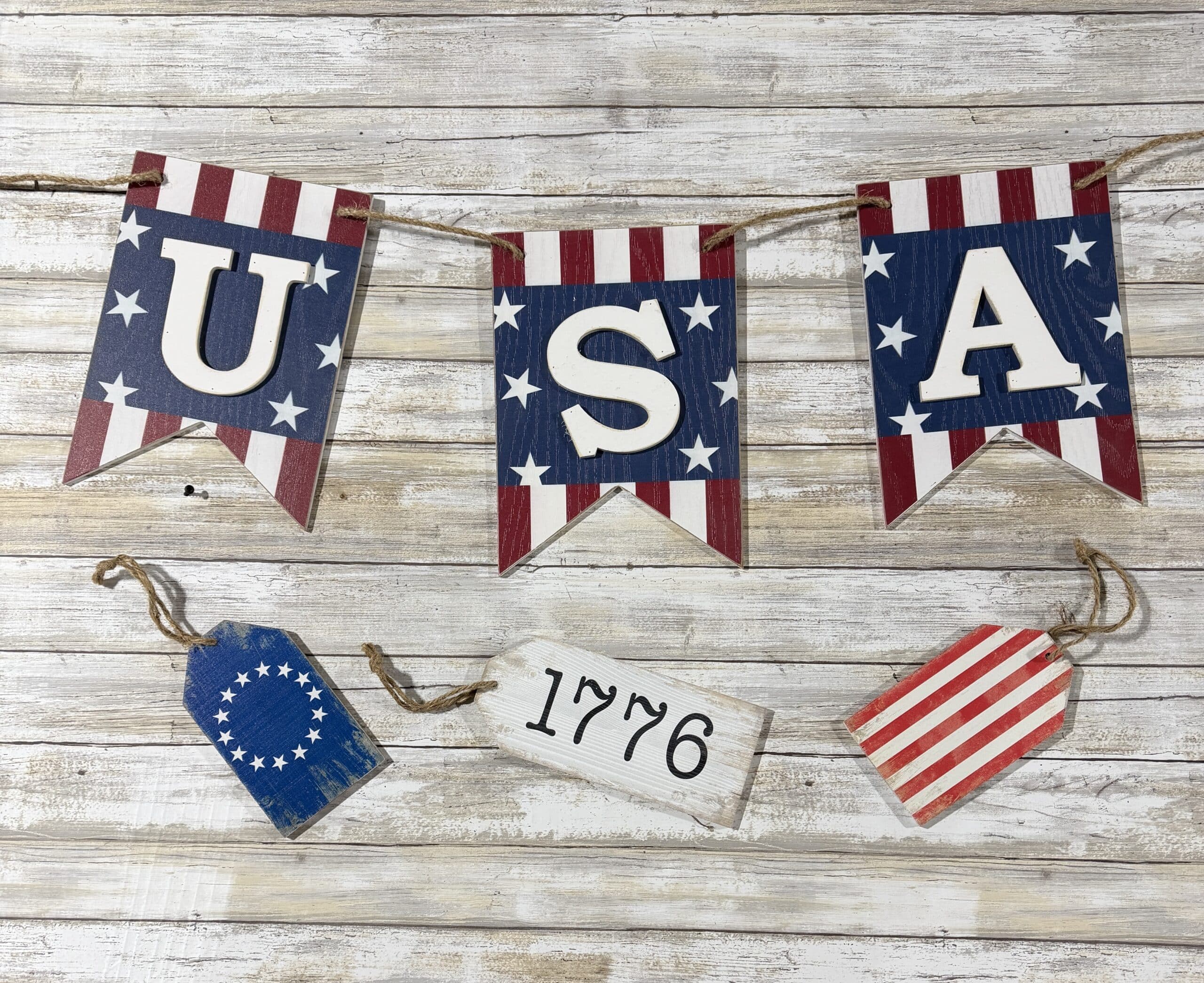 This USA Banner is made of MDF wood board and comes with 3 pendants on 48” inches of jute twine which is stapled to the back of each pendant.