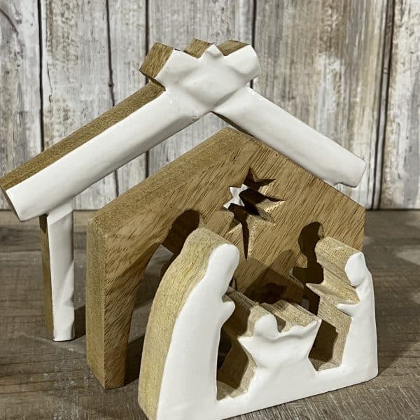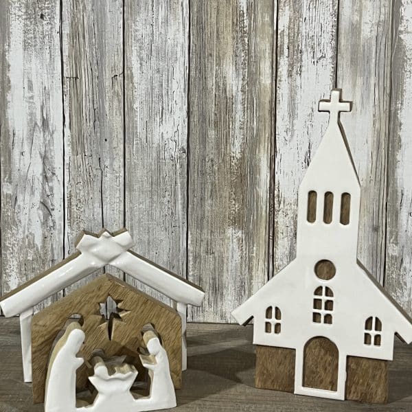 Wooden Nativity with White Enamel & Chapel of Hope Decor Set