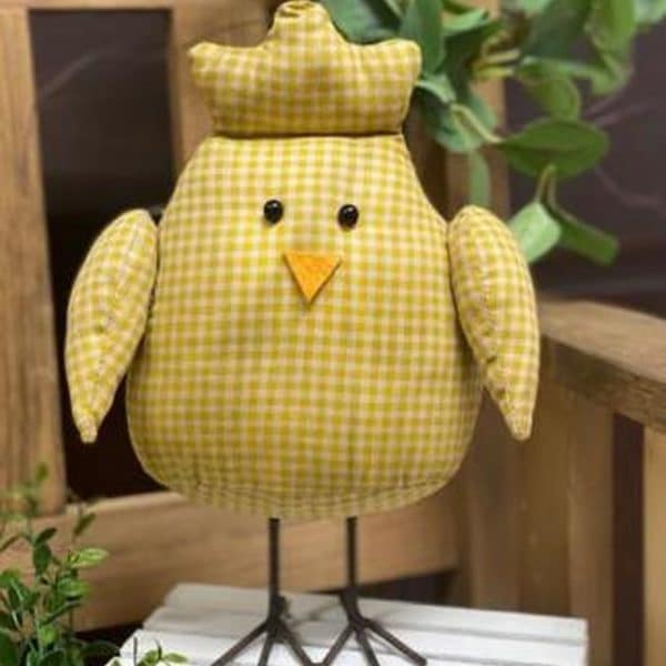 The chick is made from high-quality fabric and stands on three black metal legs, adding a touch of whimsy to any room. Its bright yellow color and gingham pattern make it a perfect addition to your spring or Easter decor.