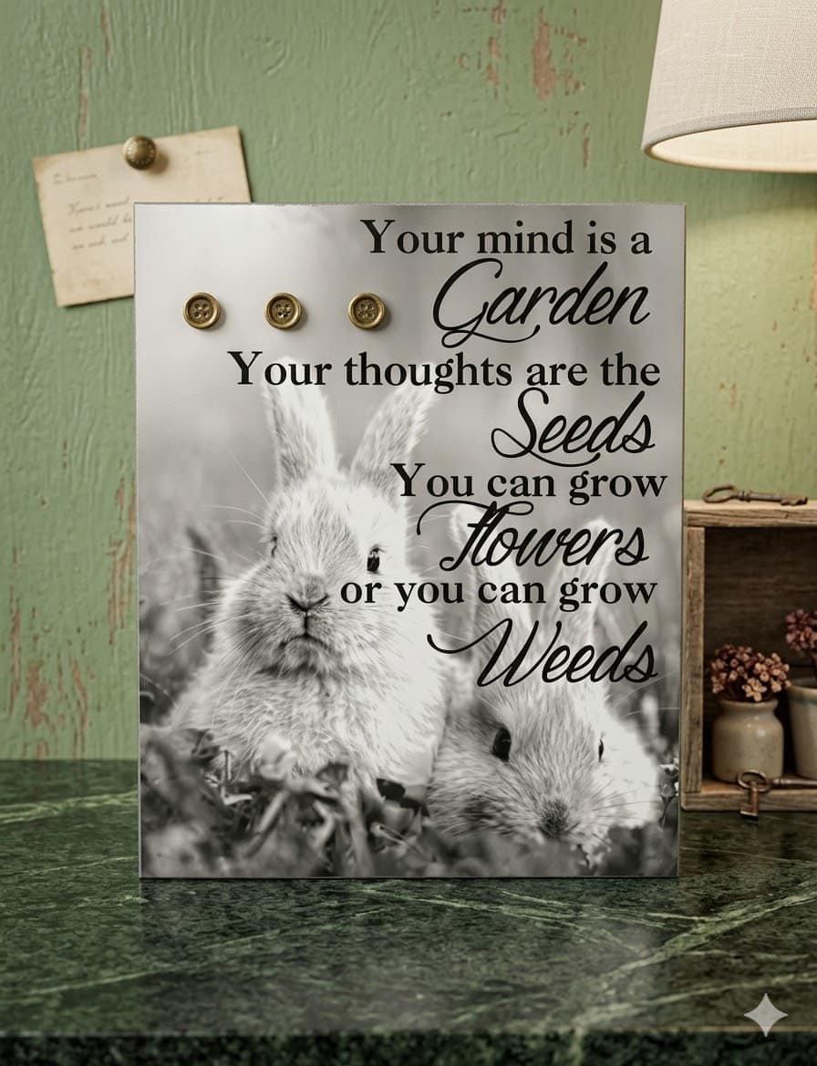 This is a wood box sign done in black and white adorable bunny print with the saying Your mind is a garden Your thoughts are the seeds You can grow flowers or you can grow weeds. The photo is accented by three bright yellow buttons.